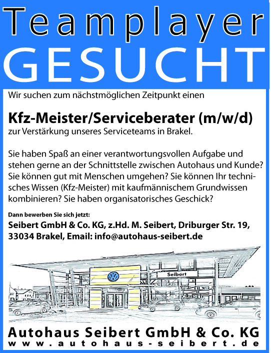 für unseren modernen Servicebetrieb mit Herstellerzertifizierung für Volkswagen, Audi und Volkswagen Nutzfahrzeuge in 33034 Brakel suchen wir in Vollzeit zum 1.1.2026 einenKfz-Meister / Serviceberater (m/w/d)Wir sind ein moderner, inhabergeführter Kfz-Betrieb und zertifizierter Servicepartner der Marken Volkswagen, Audi und Volkswagen Nutzfahrzeuge. In unserem motivierten Team legen wir Wert auf höchste Qualität, fachliches Know-how und persönlichen Kundenkontakt. Um unseren hohen Serviceanspruch weiter auszubauen, suchen wir Sie als Kfz-Meister (m/w/d) oder Serviceberater (m/w/d) mit Leidenschaft für moderne Fahrzeugtechnik. Sie unterstützen uns an der Schnittstelle zwischen Kunde und Werkstatt. Ihre Aufgaben· Kundenberatung und -betreuung im Servicebereich · Erstellung von Kostenvoranschlägen · Auftragsannahme mit dem Kunden · Koordinierung und Organisation der Werkstattabläufe · Durchführung und Kontrolle von Wartungs- und Reparaturarbeiten · Sicherstellung hoher Qualitätsstandards und Kundenzufriedenheit · Enge Zusammenarbeit mit dem Werkstatt- und Serviceteam Ihr Profil· Abgeschlossene Ausbildung als Kfz-Mechatroniker (m/w/d), idealerweise mit Weiterbildung zum Kfz-Meister (m/w/d) · Fundierte Kenntnisse moderner Fahrzeugtechnik, Schwerpunkt im VW-Konzernbereich wünschenswert · Freude am Umgang mit Kunden und Mitarbeitern – Sie sind kommunikativ, serviceorientiert und teamfähig · Bereitschaft zur regelmäßigen Weiterbildung und ggfs. Zertifizierung über die Herstellermarken · Selbstständige, strukturierte und lösungsorientierte Arbeitsweise Wir bieten Ihnen· Einen sicheren Arbeitsplatz in einem zukunftsorientierten Unternehmen · Ein modernes Arbeitsumfeld mit neuester Diagnosetechnik · Regelmäßige Schulungen und markenspezifische Weiterbildungen · Ein engagiertes, kollegiales Team mit flachen Hierarchien Finden Sie sich in unserem Profil wieder? Wenn ja, dann bewerben Sie sich jetzt mit einer aussagekräftigen Bewerbung, lernen uns kennen und nutzen Ihre Chance!